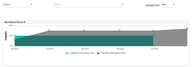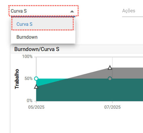 Através do campo que fica mais à esquerda (Curva S) nós podemos selecionar qual tipo de gráfico queremos visualizar, como opções temos: Curva S e Burndown. Nesse caso iremos selecionar "Curva S"