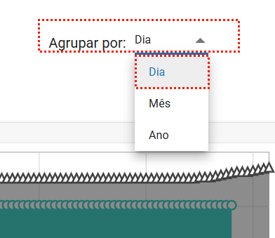 Já no campo que fica mais à direita (Agrupar por), podemos selecionar a maneira que desejamos agrupar as informações dispostas no gráfico, como opções temos: Dia, Mês e Ano. No nosso caso iremos selecionar "Dia"