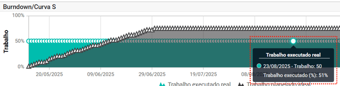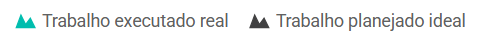 Passe o mouse sobre o ponto da linha verde, que representa o "Trabalho executado real", no dia desejado para visualizar a quantidade correspondente. A linha verde indica o trabalho executado real, enquanto a linha cinza mostra o "Trabalho planejado ideal".