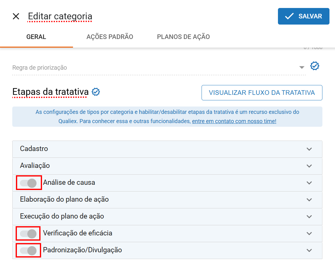 Sabemos que nem todos os processos exigem todas as etapas do PDCA. Por isso, o Qualiex oferece a possibilidade de habilitar ou desabilitar etapas diretamente pela aba de categorias. Esse recurso garante autonomia e flexibilidade para que cada organização personalize o fluxo de tratamento das ocorrências de acordo com suas necessidades.