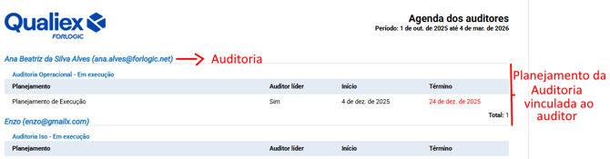 O relatório Agenda dos Auditores permite acompanhar de forma organizada a distribuição das auditorias entre os auditores, indicando tanto as atividades em andamento quanto aquelas previstas. Essa visualização facilita o planejamento da equipe, evita conflitos de escala e contribui para uma melhor gestão da carga de trabalho.