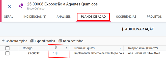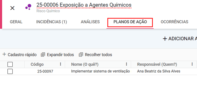 Ao abrir o risco, vá até a aba Planos de Ação. Nela, estarão listadas todas as ações vinculadas ao risco.