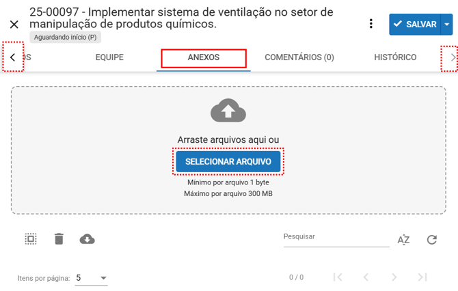 Dentro da ação, clique na aba Anexos. Caso necessário, utilize as setas para navegar estre as abas disponíveis.