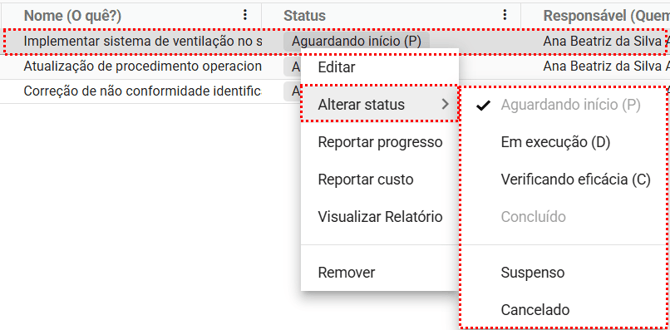 - Verificando Eficácia: A execução foi concluída e o verificador precisa confirmar a eficácia. Disponível apenas para ações com verificador.