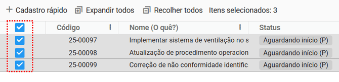 Quando você precisa atualizar várias ações de uma vez, não é necessário fazer isso individualmente. O módulo Riscos permite alterar o status em massa, tornando o processo muito mais rápido. Entretanto, para realizar a alteração em massa é necessário que todas as ações selecionadas estejam no mesmo status.