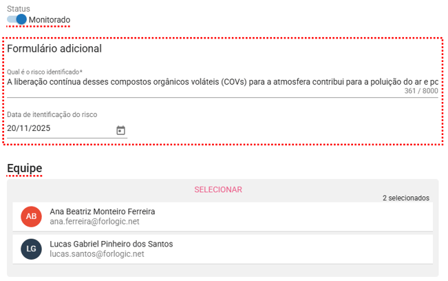 - Equipe: selecione colaboradores que acompanharão o risco.
