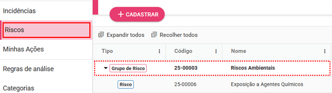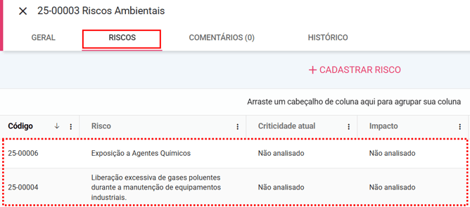 Ao acessar o grupo de risco, vá até a aba "Risco". Nela, além de cadastrar novos riscos, você pode visualizar e acessar todos os riscos já registrados nesta categoria.