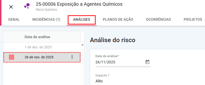 Na tela de dados gerais do risco, vá até a aba “Análises” e selecione a análise onde deseja criar as ações.