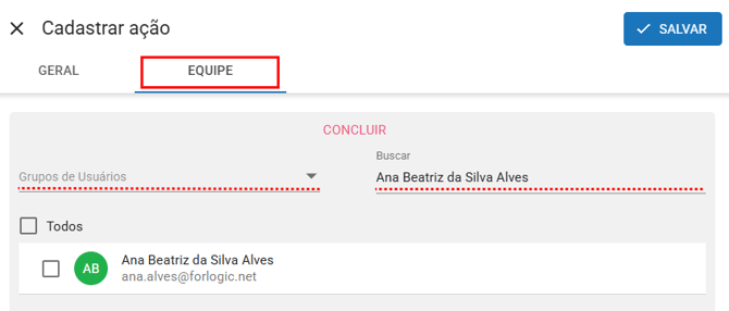 Depois do cadastro, acesse a aba “Equipe” para selecionar os colaboradores que serão notificados. É possível escolher usuários individualmente ou por grupo.