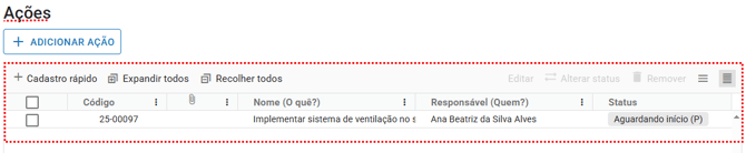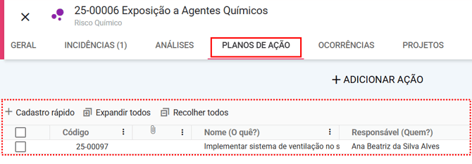 Após cadastrar e salvar as ações na análise de risco, você poderá visualizá-las tanto na própria análise (onde foram criadas) quanto na aba específica “Ações”, que reúne todas as ações cadastradas.