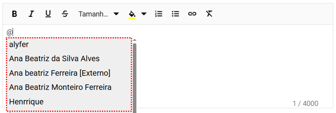 Caso queira notificar alguém, utilize o símbolo @ e selecione o usuário desejado, entretanto só é possível mencionar usuários que tenham acesso ao módulo Riscos.