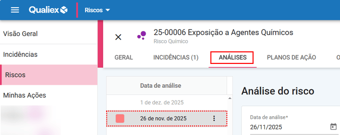 Com o risco aberto, vá até a aba “Análises”, escolha a data de análise que deseja editar e clique com o botão direito do mouse para abri-la.