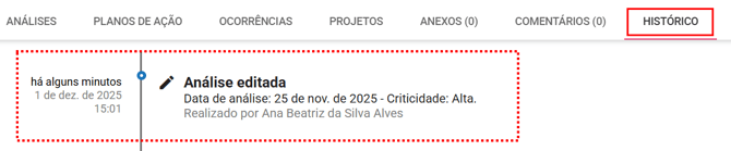 Todas as modificações serão registradas no histórico, indicando que a análise foi alterada. Essa funcionalidade garante transparência e rastreabilidade, permitindo que todos os usuários autorizados acompanhem quando e por quem a modificação foi realizada.