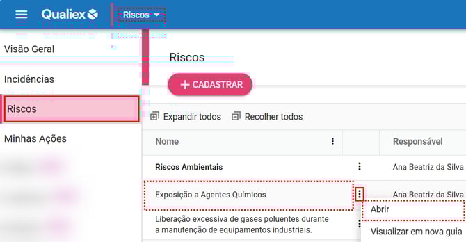 Para enviar um arquivo anexo a um risco, clique com o botão esquerdo do mouse sobre o risco desejado ou acesse o menu de contexto