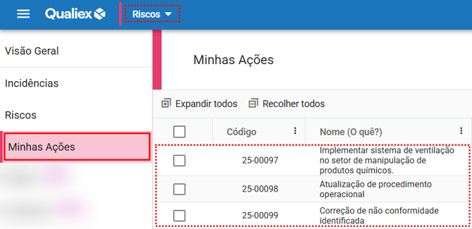 Na aba Minhas Ações, você encontra todas as ações em que está como responsável, independentemente do status ou do risco.