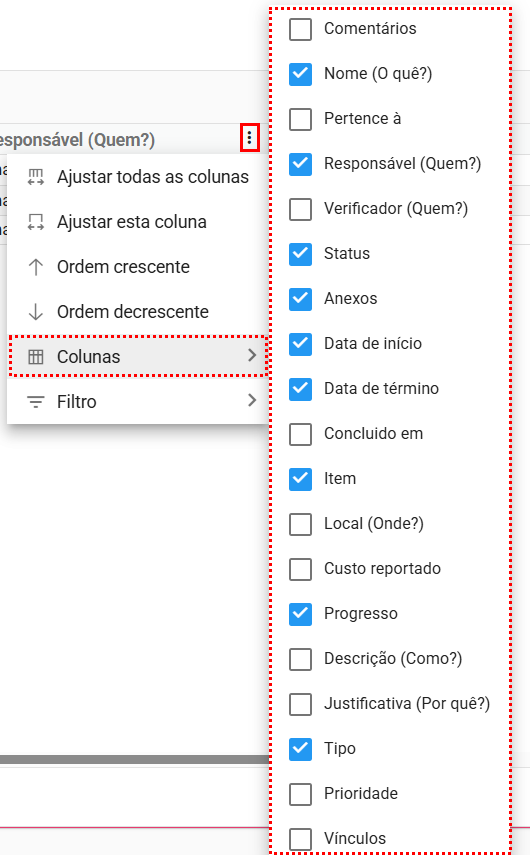 A aba Minhas Ações oferece recursos para personalizar a visualização das informações, tornando a gestão das tarefas mais prática e eficiente. Entre essas opções, está a organização das colunas, que permite ajustar tamanhos, ordenar dados e escolher quais informações serão exibidas.