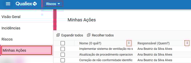 Para usar a aba Minhas Ações e organizar as colunas, não é necessário nenhuma permissão especial. Qualquer colaborador com acesso ao módulo Risco em sua unidade pode visualizar essa aba e realizar essa configuração.