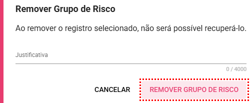 Após escolher a opção, o sistema exibirá um alerta solicitando a confirmação da operação. Clique em "Remover grupo de risco" para concluir.