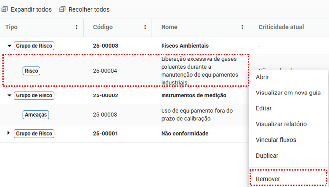 Se por algum motivo você não precisar mais manter os registros de um risco no Qualiex, é possível removê-lo. Essa ação deve ser feita com atenção, pois não é possível restaurar informações removidas.