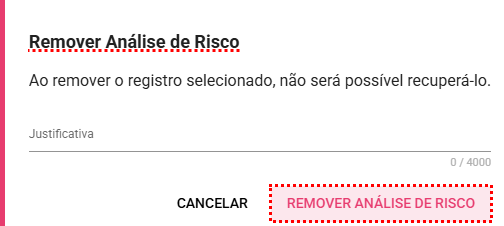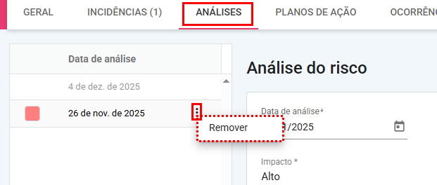 Para remover a análise do risco é necessário ser o responsável pelo grupo de risco, ou responsável pelo risco, ou ter a permissão "Editar todos" do grupo de risco, ou "Editar todos" do risco, ou "Gerenciar análise de risco". Definido nas Configurações > Papeis e permissões.