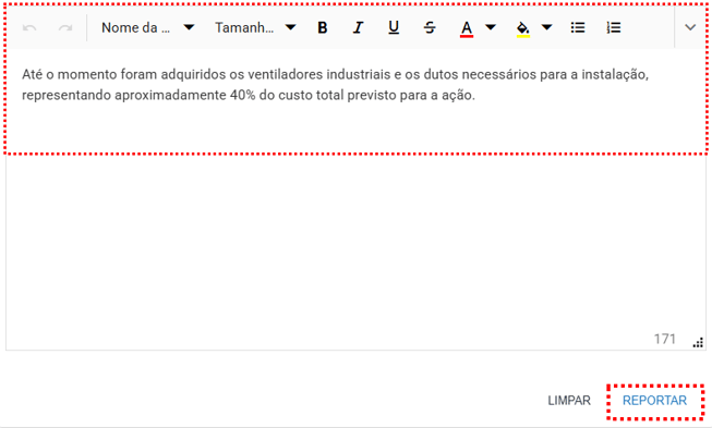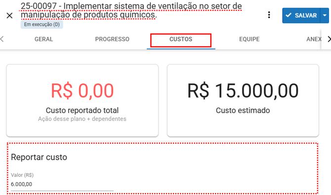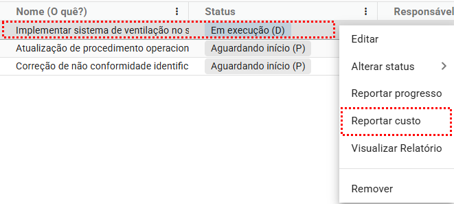 Para que o custo de uma ação possa ser reportado, ela precisa estar com o status “Em execução”.