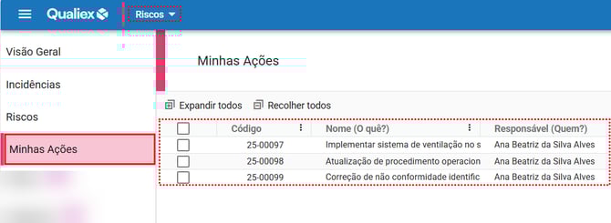 Sempre que houver um risco registrado com ações atribuídas aos colaboradores, elas poderão ser consultadas facilmente pela aba Minhas Ações.