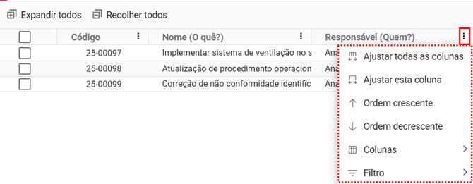 Além disso, pelo menu de contexto das colunas, é possível ajustar o tamanho das colunas, organizar informações em ordem crescente ou decrescente, e escolher quais colunas serão exibidas.