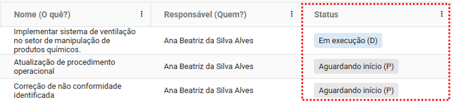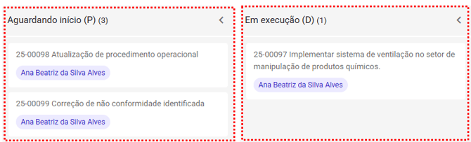- Kanban: apresenta as ações em painéis, categorizadas pelo status atual.