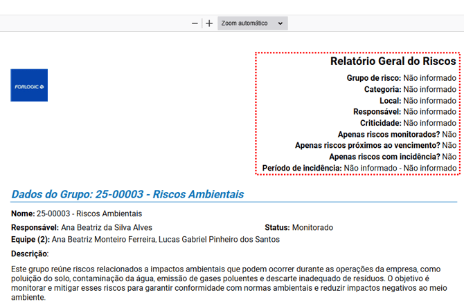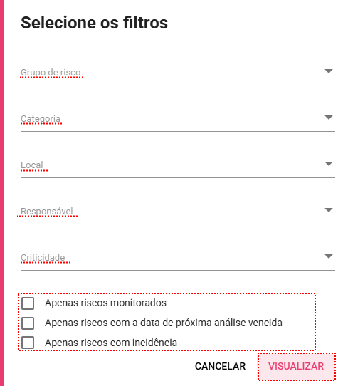 Se nenhum filtro for selecionado, o relatório exibirá todos os riscos que o usuário tem permissão para visualizar.