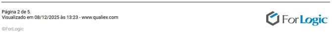 Ao final de cada página do relatório, serão exibidas informações que garantem a rastreabilidade do documento, como qualidade das páginas, nome da empresa, data e hora de visualização e o site de acesso utilizado. No canto inferior direito, também aparecerá a logo da ForLogic, reforçando que o relatório foi gerado por um sistema computadorizado e aumentando a confiabilidade das informações.