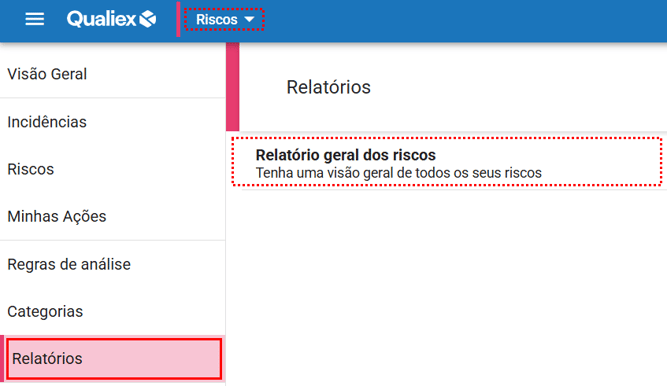 No menu à esquerda no módulo Riscos, selecione a aba Relatórios e clique em “Relatório geral dos riscos”.