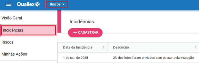 Todos os usuários que possuem acesso ao módulo Riscos podem visualizar as incidências registradas. Além disso, também é possível realizar o cadastro de novas incidências diretamente na plataforma, tornando o processo mais ágil e colaborativo.