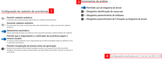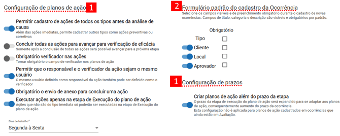 Se o seu processo de tratamento e gerenciamento de ocorrências possuir particularidades — seja no cadastro, na análise de causa, no plano de ação ou nos prazos de conclusão — é possível realizar ajustes diretamente pela aba de Configurações.