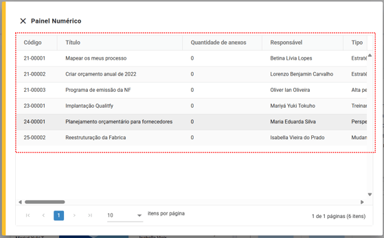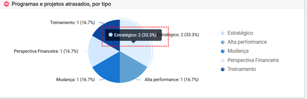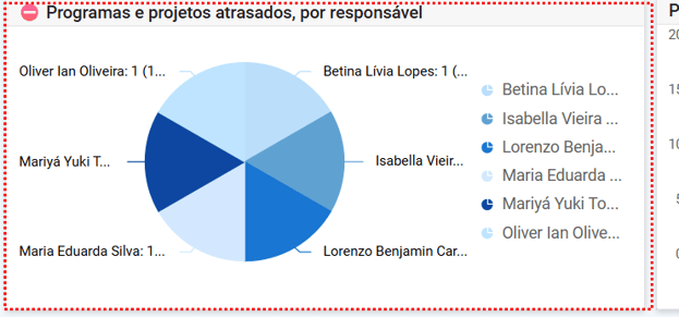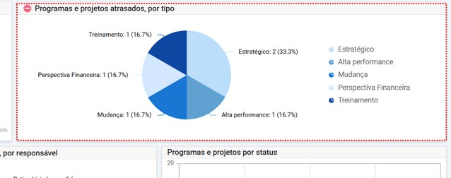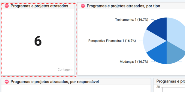 Ao clicar sobre os painéis, uma janela será aberta exibindo mais detalhes sobre o gráfico. Por exemplo, no painel "Programas e projetos atrasados" nesta base específica, atualmente temos 6 programas e projetos nesse estado.