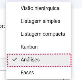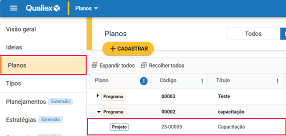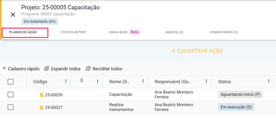 Para visualizar as opções disponíveis, vá na aba "Planos" selecione o projeto desejado, acesse a aba "Planos de Ação" e escolha o modo de visualização que melhor atenda às suas necessidades.