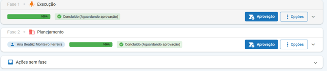 Ambas as fases estão com 100% de progresso, e o status geral é "Concluído (Aguardando aprovação)", indicando que todas as ações foram realizadas e estão em processo de validação