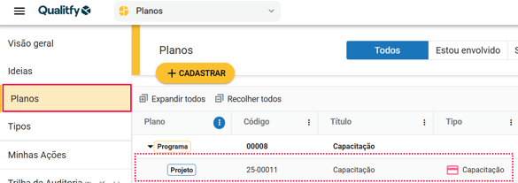 Para visualizar as opções disponíveis, vá na aba "Planos" selecione o projeto desejado, acesse a aba "Planos de Ação" e escolha o modo de visualização que melhor atenda às suas necessidades.