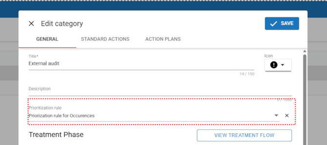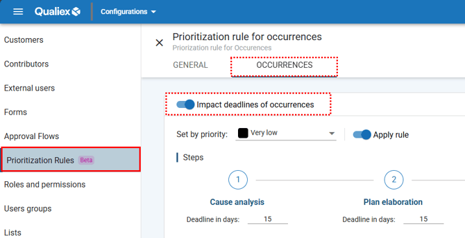 The limits and workflows are defined in the ‘Occurrences’ tab of the Prioritization Rule, within the Settings module.